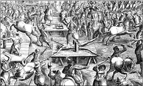 Четвертование является предметом споров многих историков. Особенно та часть, где заключенного тащили позади лошади к месту казни или изымали его внутренности, пока тело еще было живо. Существует множество кровавых интерпретаций, которые включают удаление сердца, обескровливание и обезглавливание. Но все историки сходятся в одном: человеческие остатки разделяли на четыре части, часто с помощью сильных лошадей, которые тянули тело в противоположных направлениях. Это позволяло законодателям наглядным примером сдерживать жителей одновременно в четырех разных местах.