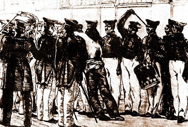 Наказание за это преступление было тщательно описано в 1805 году в книге «Принципы и практика военно-морских и военных судов». Весь экипаж формировали двумя противоположными шеренгами, по одной на каждой стороне корабля. Каждому человеку был дан небольшой витой шнур из пряжи, с двумя/тремя узлами на нем. Преступника затем раздевали до пояса и заставляли ходить (75 шагов в минуту), не бегать, между рядами моряков, пока его товарищи по экипажу хлестали виновного своими веревками. Чтобы быть уверенным, что он двигается достаточно медленно, корабельный Мастер шел перед ним, держа меч у его груди, а корабельный капрал с мечом следовал позади. Преступник должен был обойти шеренгу, по крайней мере, один раз, но не более трех. Практика выполнения "прохода сквозь строй" была упразднена в 1806 году.