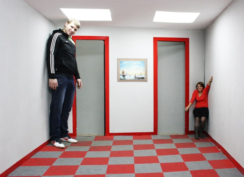 Эта комната создана по принципу оптической иллюзии психологом и окулистом Адельбертом Эймсом еще в 1946 году. Помещение воспринимается, как прямоугольник, хотя, таковым на самом деле не является. Такой эффект создают черно-белые клетки на полу, и оригинально сконструированные стены. Человек вблизи, выглядит для наблюдателя великаном, а в дальнем углу – лилипутом. Кроме того, при передвижениях создается иллюзия резкого изменения размеров человека. Любители психологических экспериментов, вам на Крымский Вал, 9.
