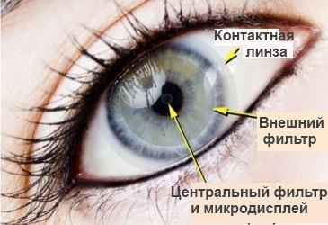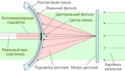 По сути, очки представляют собой дисплей с проектором, проецирующим сведения в цифровом варианте через центральный фильтр на сетчатку глаза. Информация о реальном мире передается через периферийные фильтры.