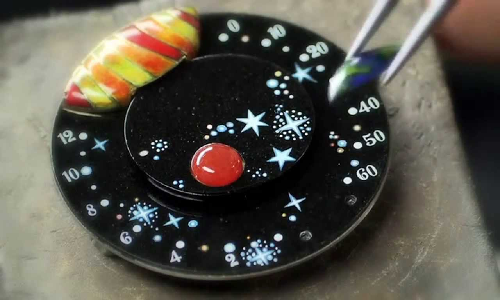 Часы представляют собой ни много ни мало миниатюру нашей Солнечной системы. На циферблате можно спокойно разглядеть Землю, выполненную из бирюзы, Меркурий – из серпентина, Венеру – из хлоромеланита, Марс – из яшмы, Юпитер – из агата и Сатурн – из сугилита. Заодно, можно подучить географию и химию!