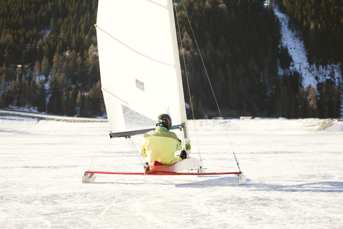 К саням с тремя стальными коньками крепится парус. Для катания лучше выбирать ветряный день и ровную ледяную поверхность.