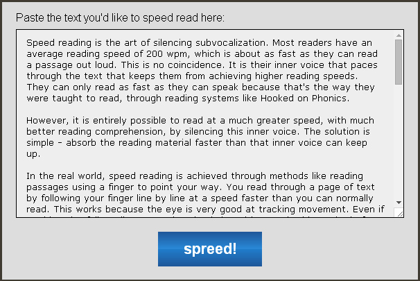 Существует много веб-приложений, которые научат вас читать текст быстрее. Одним из самых распространенных таких приложений является Spreeder. Суть действия программы заключается в том, что вы вставляете в нее текст, который вам необходимо прочесть. Программа показывает каждое слово всего на несколько секунд, затем оно исчезает и появляется следующее слово. Это позволяет не только научиться читать с большей скоростью, но и избавиться от привычки перечитывать предыдущие слова. Также вы самостоятельно можете настроить скорость вывода текста на монитор и количество слов, которые будут показываться за раз.
