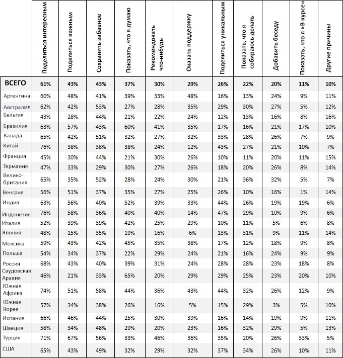 "Нью-Йорк Таймс" провел удивительное исследование о том, почему мы репостим записи. И оно остается одним из наиболее информативных докладов на тему использования социальных медиа. Это исследование выявило пять основных причин, побуждающих нас поделиться контентом с друзьями:1. Чтобы обмениваться ценным или развлекательным контентом друг с другом. 49 % респондентов считают, что совместное использование медиа позволяет им информировать друг друга об интересных продуктах, идеях и мыслях, которые заботят их, или дают возможность менять мнение или поощрять к определенным действиям.