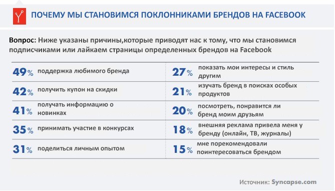 Когда дело доходит до решения ставить ли лайк брендам и компаниям, мотивация выбора выглядит очень просто. Исследование Syncapse обнаружило, что большинство людей делают это решение на основе практических соображений, т.е. они хотят получить купоны и регулярные обновления от компаний, которым они поставили лайк.