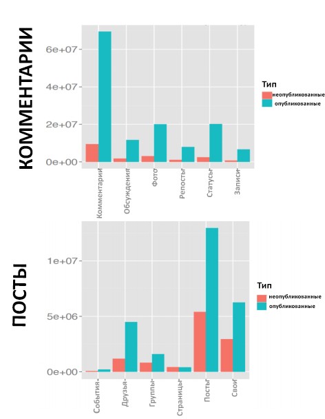 На этой диаграмме вы можете увидеть количество комментариев к другим комментариям, фотографиям, постам и т.д., прошедших и не прошедших цензуру, а также репостов записей друзей, групп и т.п, которые также не всегда выкладываются.