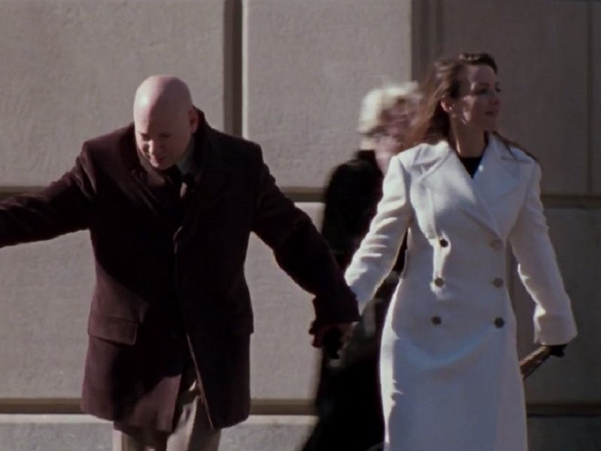 В своей последней сцене Шарлотта Йорк-Голденблатт выглядит как никогда утонченно, в простом белом пальто. Во время прогулки своего спаниеля Элизабет Тейлор с мужем Гарри Голденблаттом она сочетает пальто с элегантными черными перчатками и черным свитером под ними.